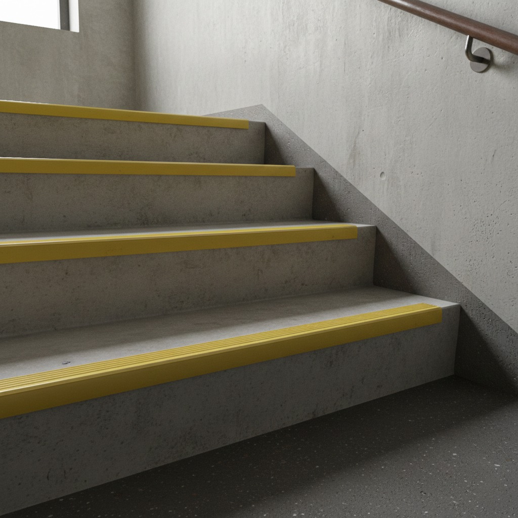 Señalización y protección de bordes en escaleras de concreto, madera o metal en entornos industriales.